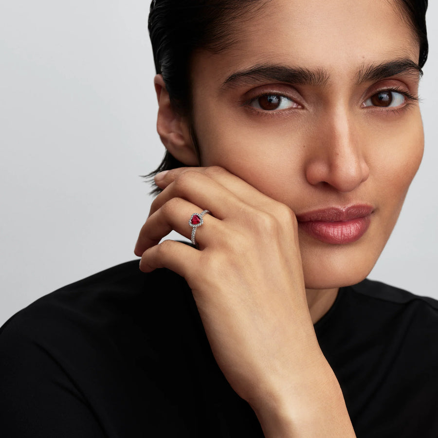Kogu südamest, sära kõikjal. Meie sterlinghõbedast sõrmus on kaunistatud reljeefse punase südame kujulise kristalliga, pavé-kattega halo ja pooleldi pavé-kattega rõngaga. Armastusest ja tänulikkusest inspireeritud ideaalselt kooskantav ese.
